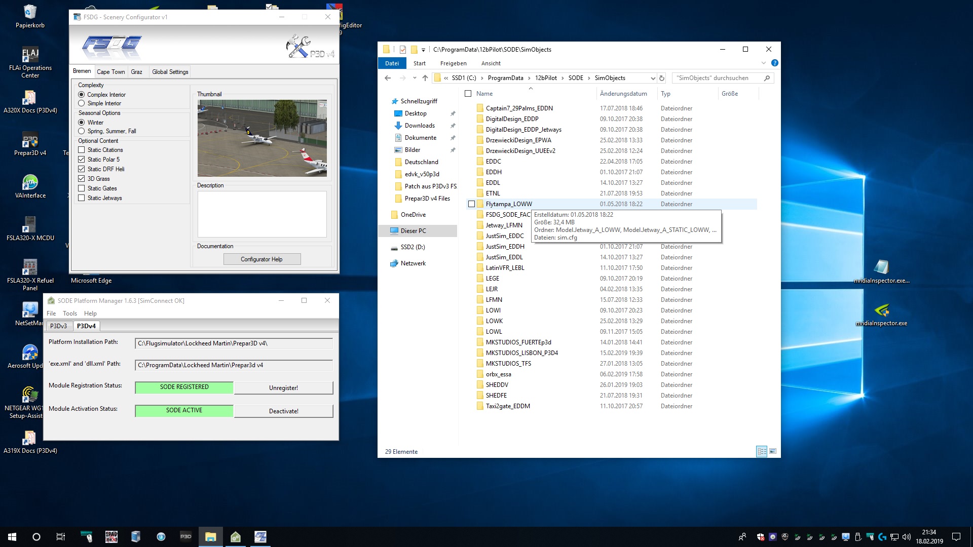 Bei mir will SODE auch nicht. Ich finde keinen Eintrag unter Programdata/12bPilot/SODE/SimObjects lediglich den Ordner FSDG_SODE_FACT. Der Rest von FSDG ist nicht da. Was habe ich da falsch gemacht? Bisher habe ich einfach die Szenerien installiert und SODE hat funktioniert.
