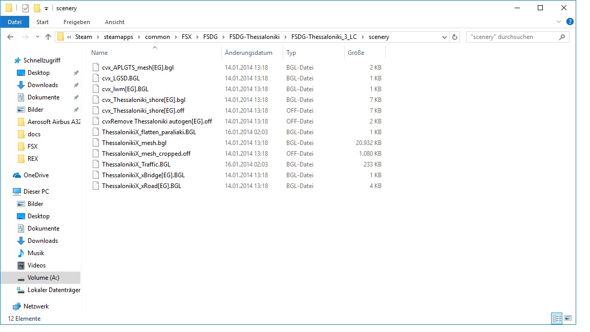 Ist Windows auf der Festplatte A installiert? Möglicherweise hat das Setup Probleme dort die scenery.cfg zu finden. Für Thessaloniki gibt es drei Ordner, die in dem Fall zur Szeneriebibliothek hinzugefügt werden müssen. Die Bibliothek sollte dann so aussehen: