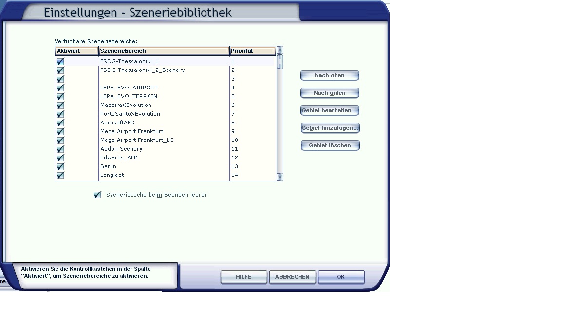 Ist Windows auf der Festplatte A installiert? Möglicherweise hat das Setup Probleme dort die scenery.cfg zu finden. Für Thessaloniki gibt es drei Ordner, die in dem Fall zur Szeneriebibliothek hinzugefügt werden müssen. Die Bibliothek sollte dann so aussehen: