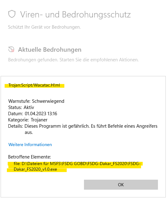 ich habe mir heute die neue GOBD-Szenerie für den MSFS gekauft. Leider kann ih sie nicht installieren, da sie vom Win11-Defender als schwerwiegende Bedrohung erkannt und dann auch gelöscht wird.