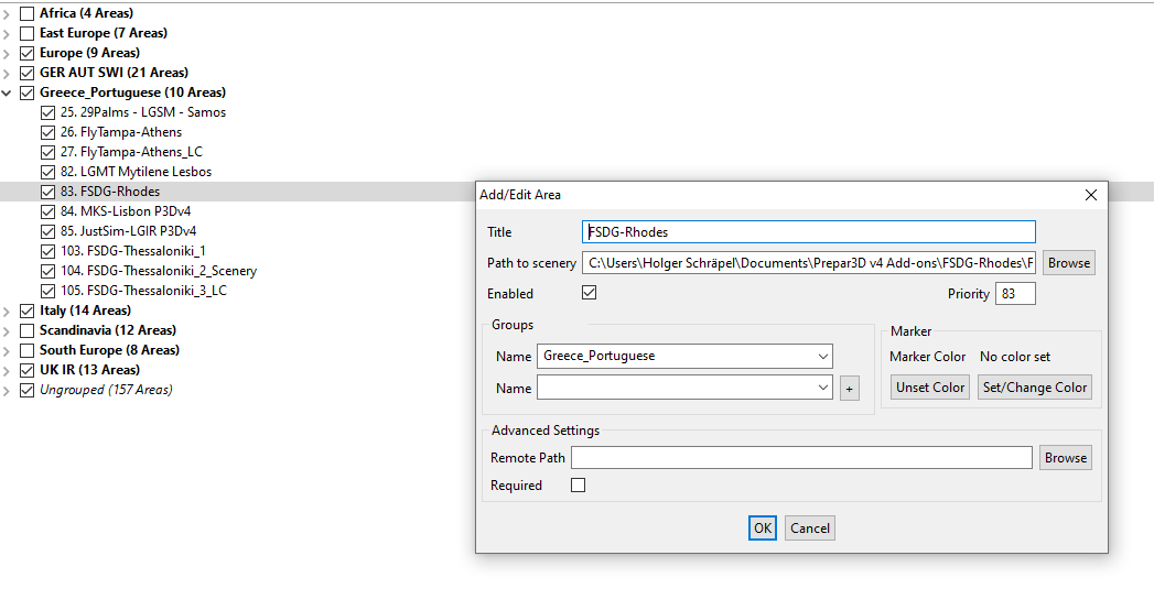 Wurde das Addon manuell installiert oder verschoben? Offenbar ist die Szenerie nicht richtig angemeldet. Normalerweise kontrolliert dies die Add-On.xml im entsprechenden Eigene Dokumente P3Dv4 AddOns Ordner.