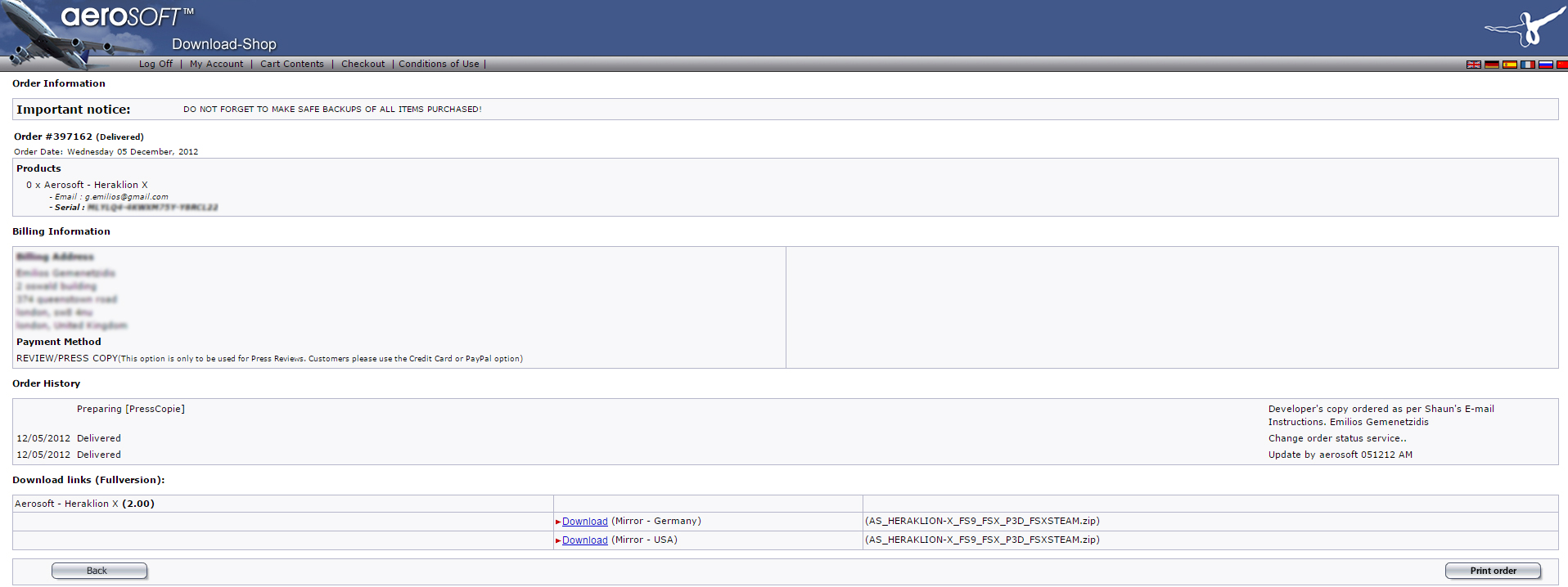 We have to forget it for our purpose now. The purchased made at PC Aviator was refound, because the sale was an error issued from a hack of their site (Not from me !).
