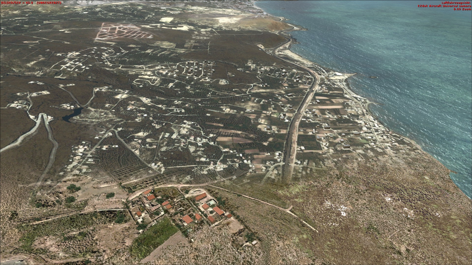 In der Tat, die Übergänge sind deutlich sichtbar. Allerdings lässt sich dies generell nicht vermeiden, da es bislang (nach unserem Kenntnisstand) noch kein wirklich gelungenes Addon für Kreta gibt, welches die gesamte Insel realistisch abbildet. Sowohl die Standard-Texturen des FSX als auch Austauschtexturen wie GEX sind relativ weit vom tatsächlichen Aussehen der Insel entfernt. Es wäre nicht sinnvoll das Luftbild an die eher unrealistischen Farben bzw. Texturen der Standard-Szenerie oder GEX anzupassen. Daher lässt sich ein gewisser Übergang zwischen Addon und Umgebungsszenerie generell nicht vermeiden. Wir sehen im Moment keine Möglichkeit dies zu ändern.