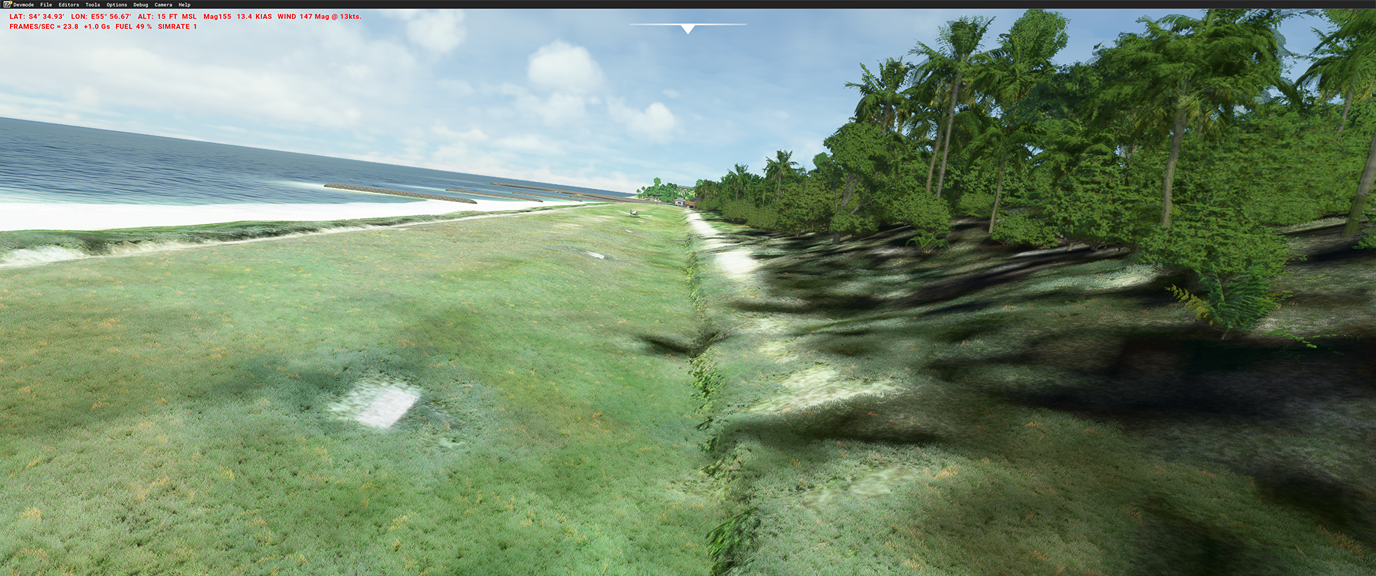 - many missing objects compared to the old FSX/P3D version (which is more detailed in many occasions). E.g. plane wreckage at the end of the airstrip at Marie-Louise is missing in the MSFS version